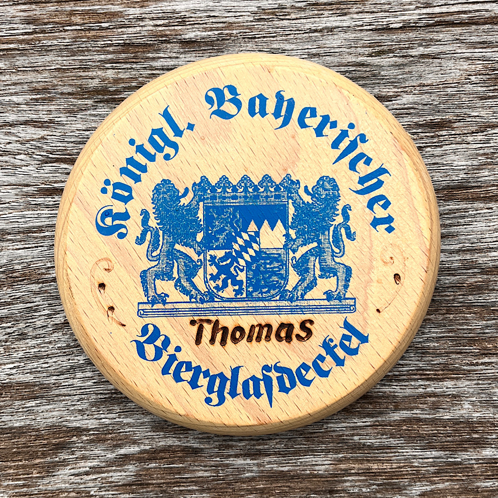 Bierdeckel aus Buchenholz, mit Wappen bedruckt
