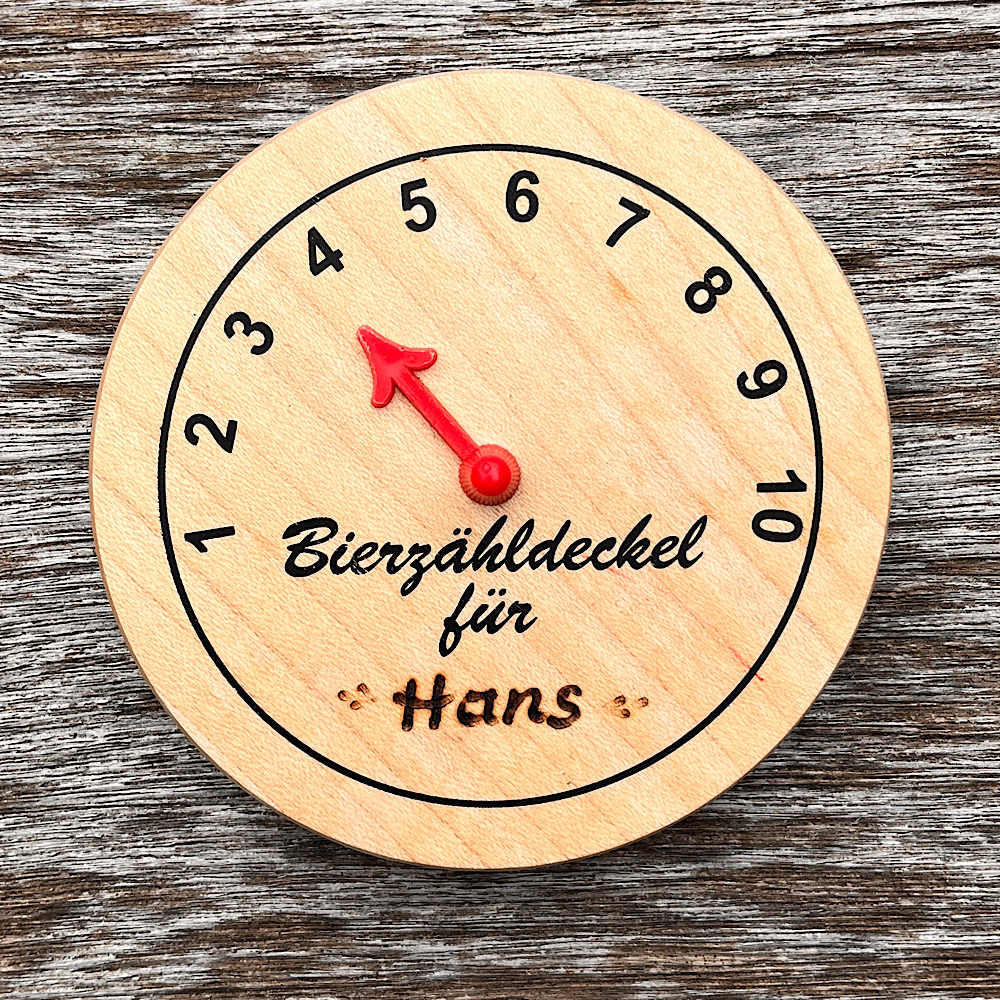 Bierdeckel aus Buchenholz, 1-10 bedruckt, Plastikpfeil zum Drehen